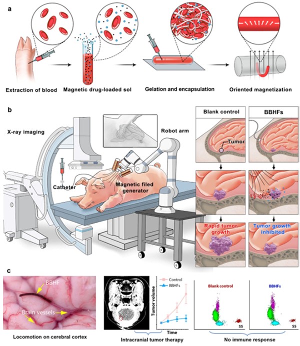 在国家自然科学基金项目(批准号:62022087、62125307、52475308、U22A2064)的资助下,中国科学院深圳先进技术研究院徐天添研究员、深圳大学王奔副教授、香港中文大学张立教授等开展交叉合作,提出的磁驱动血凝胶纤维机器人在颅内深部肿瘤治疗方面取得进展。研究成果以“Magnetically-driven biohybrid blood hydrogel fibres for personalized intracranial tumour therapy under fluoroscopic tracking”为题,于2025年5月1日发表于《Nature Biomedical Engineering》上。论文链接:https://www.nature.com/articles/s41551-025-01382-z。