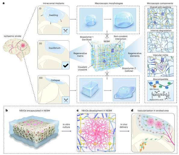 该研究通过仿生基质设计实现了用合成水凝胶支撑的血管类器官移植治疗缺血性脑卒中,为克服颅内复杂微环境下的神经再生难题提供了新策略。