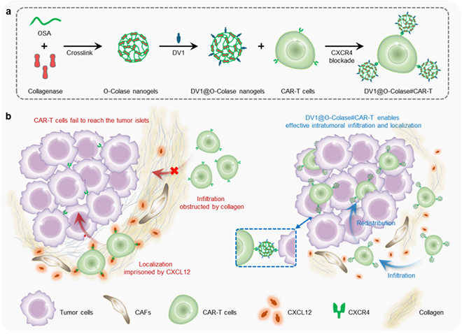 在国家自然科学基金项目(批准号:22272091、U24A20732、82061148009)资助下,山东大学药学院栾玉霞教授团队在CAR-T细胞疗法治疗实体瘤的研究方面取得进展。相关成果以“胶原酶纳米凝胶背包优化CAR-T细胞治疗胰腺癌的疗效(A collagenase nanogel backpack improves CAR-T cell therapy outcomes in pancreatic cancer)”为题,于2025年5月19日在线发表于《自然·纳米技术》(