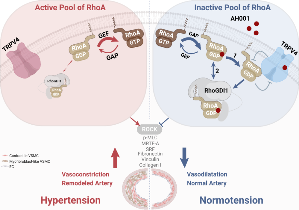 高血压患病率持续攀升,易引发多种心血管并发症,已成全球重大公共卫生挑战。传统五大类一线降压药(ACEI、ARB、β受体阻滞剂、CCB和利尿剂)因靶点分布广泛、机体代偿机制复杂,常引发药物副作用和耐药问题,导致许多患者血压控制不佳,亟需开发更精准、安全的新策略。血压稳定的核心在于血管的“张弛有度”,这离不开血管平滑肌细胞(Vascular smooth muscle cell, VSMC)的精细调控。其中,瞬时受体电位香草酸4型通道(Transient receptor potential vanilloid 4, TRPV4)是一种广泛分布于动脉壁的非选择性阳离子通道,通过调控钙离子流动直接影响血管舒缩功能,在维持血压稳态中发挥关键作用。最新研究发现,Ras同源蛋白A(Ras homolog family member A, RhoA)可结合于TRPV4的ARD区域并抑制其活性。然而,TRPV4-RhoA复合物在血管功能及高血压发生发展中的具体调控机制尚不明确,深入解析高血压状态下TRPV4-RhoA的相互作用及其动态调控规律,对解锁新型降压靶点并开发新药具有重要意义。